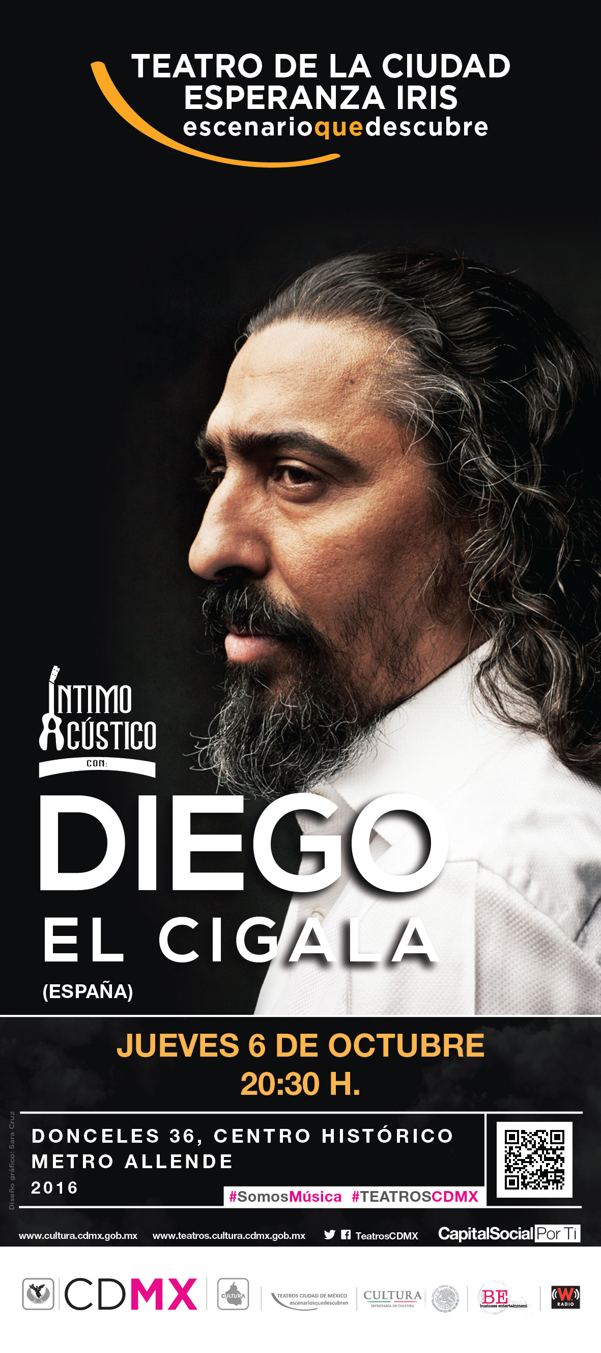Diego El Cigala realizará un concierto acústico en el Teatro de la Ciudad Esperanza Iris, donde dará cierre a su gira internacional, realizando una presentación íntima a piano y voz que gracias al éxito obtenido en sus presentaciones en el Teatro Metropólitan, agotando las localidades, decide presentarse una vez más para deleitar a los afortunados que asistirán éste jueves 6 de octubre, en el Teatro de la Ciudad Esperanza Iris, a las 20:30 horas.