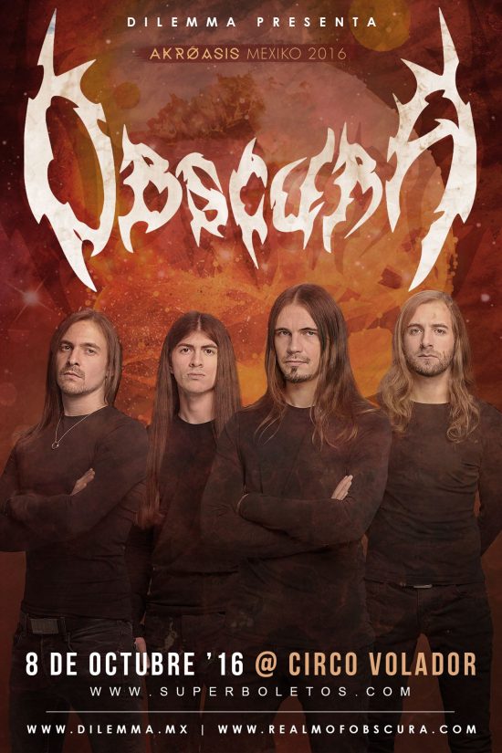 Obscura llega a México con su gira titulada «Arkroasis»del significado de «oir» o «escuchar», nombre también de su última producción realizada en 2015 y del que se desprende su nuevo sencillo «Ten Sepiroth». Ya tenían tiempo de no venir desde su presentación en el 2012 donde dejaron boquiabiertos a los que presenciaron su show y no sobra decir que son una de las mejores bandas de metal progresivo y mucha calidad musical.