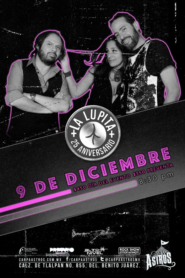 De este modo y para terminar formalmente con la extensa celebración desus primeros 25 años de existencia, la reconocida agrupación mexicana La Lupita ofrecerá un concierto más, el último del año para ellos y para sus seguidores de la capital de nuestro país el próximo viernes 9 de diciembre en la Carpa Astros a partir de las ocho y media de la noche con lo mejor de su extenso repertorio que cuenta con cinco materiales discográficos de larga duración: Pa’ Servir a Usted., Que Bonito es Casi Todo, Tres-D, Caramelo Macizo y Te Odio.