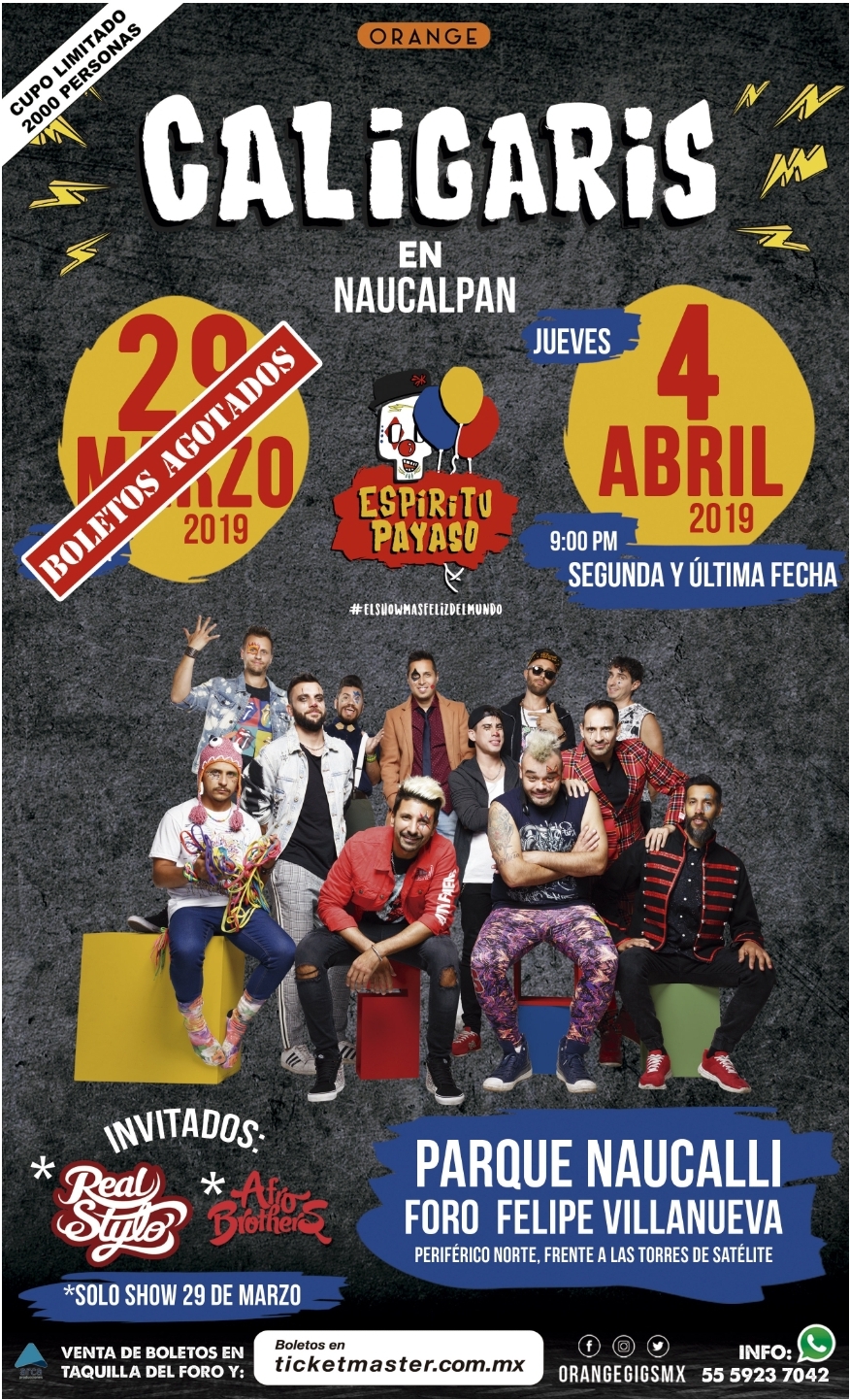 La banda visitará varios puntos de México y entre ellos se encuentran las dos fechas en Naucalpan Estado de México, en Foro Felipe Villanueva ubicado en Parque Naucalli el próximo 29 de marzo con localidades agotadas y el próximo 4 de abril a las 21:00 hrs con boletos disponibles para todas las edades, sin duda serán dos fechas inolvidables con Los Caligaris reviviendo el Espíritu Payaso en el Show más feliz de mundo.