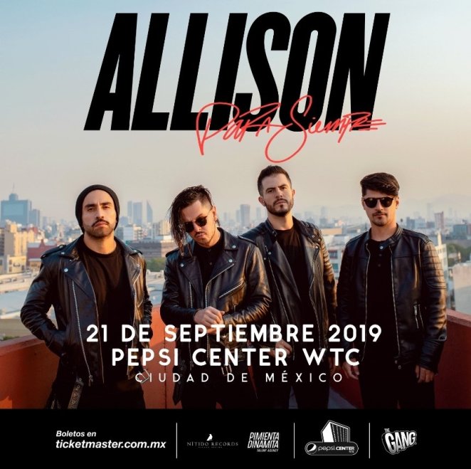 La banda Mexicana Allison, con mas de 15 años de trayectoria, 4 discos de estudio y un disco en vivo, llega a la Ciudad de Mexico este 21 de Septiembre al ‘Pepsi Center’ para presentar el show mas grande de su carrera, esta presentación se quedará en el corazón de todos sus seguidores, esos que han estado con ellos durante todos estos años.