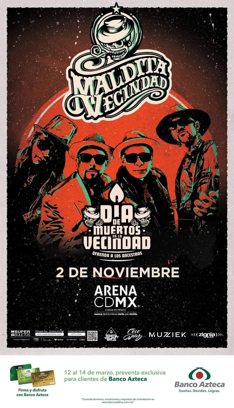 Esta fecha es el pretexto perfecto para que maldita vecindad obsequie al publico que lo ha acompañado por mas de tres décadas una noche llena de éxitos, recuerdos, invitados sorpresa y música nueva junto a una producción ambientada para esta ocasión especial en el día de muertos en la vecindad.