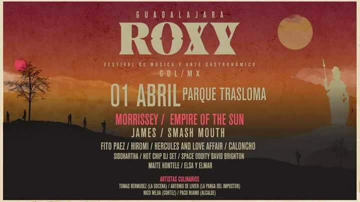 Después de tanta especulación, se dio a conocer el cartel de la primera edición del Festival Roxy a realizarse el 1 de abril en el Parque Trasloma en Guadalajara (México), con un súper cartel encabezado por Morrissey Official y Empire of the Sun, además de otras excelentes bandas que se estarán presentando en los dos escenarios que tendrá el festival, desde las 12:00 p.m. hasta las 00:30 aproximadamente.